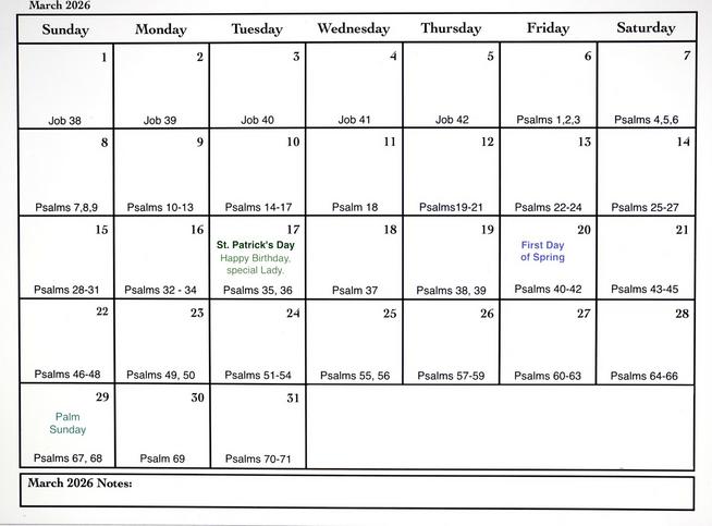 March 2026 A new month and the year Marches forward. Job will be completed the first week and then it is the Psalms, often our balms for life's difficulties. Being older and the days in which we live, life seems especially precious right now. We will be reading multiple Psalms most days since our goal is to be blessed to read through the Bible- together. We are glad to have you with us on our journey. May God protect you and your loved ones this month. 🙏🏻