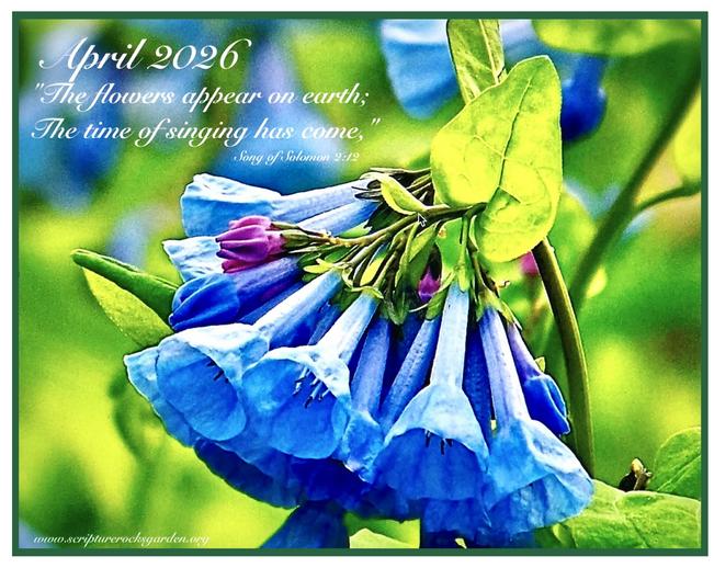 April 2026 The Virginia Bluebells are up a few inches and a lush green carpets the Scripture Rocks Garden. I wonder how poet King David would describe such beauty? Reading multiple Psalms most days has worked out very well and we eagerly look forward to each night's reading. May God bless and protect you and your loved ones as the glory of Spring begins. 🙏🏻