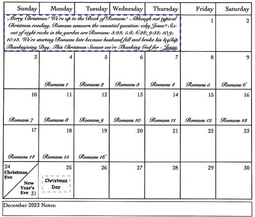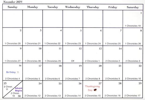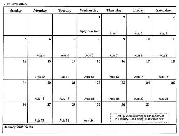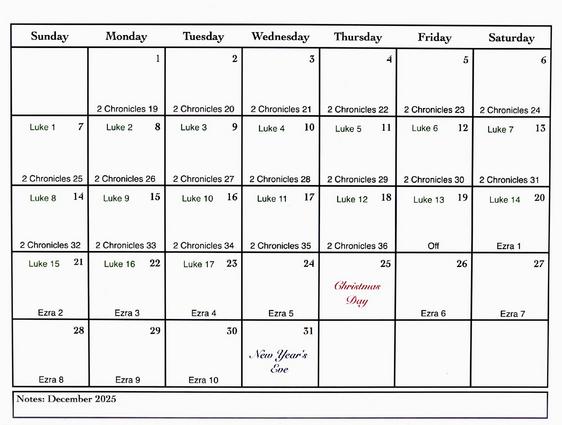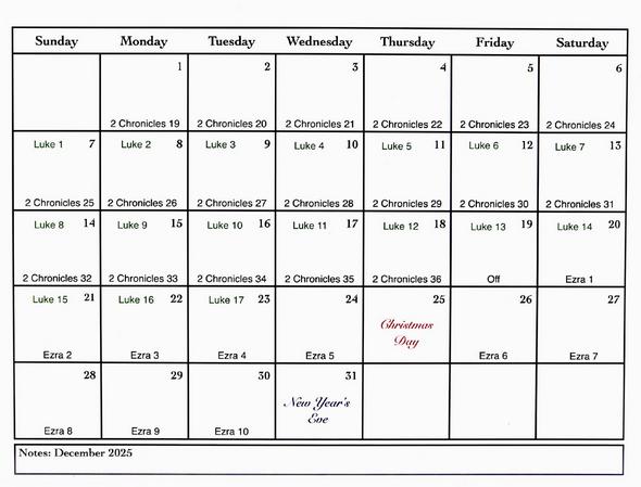 From January - June 2024 we finished the New Testament and read Romans 1 through Revelation. From July - November 2024 we read Genesis 1 to Leviticus 27. We read Luke in December 2024.