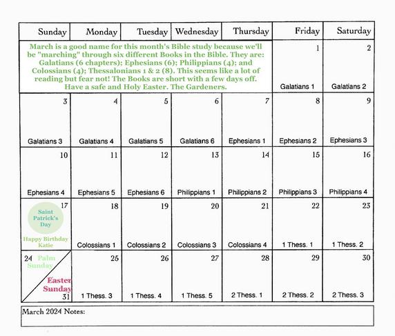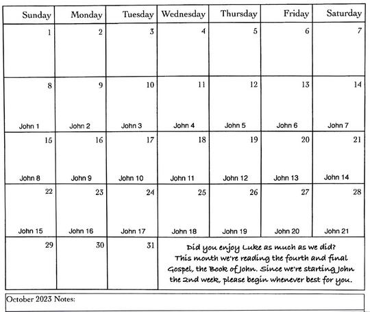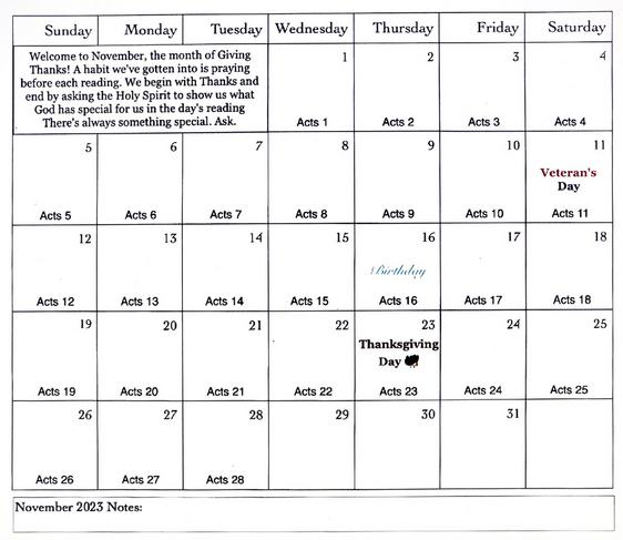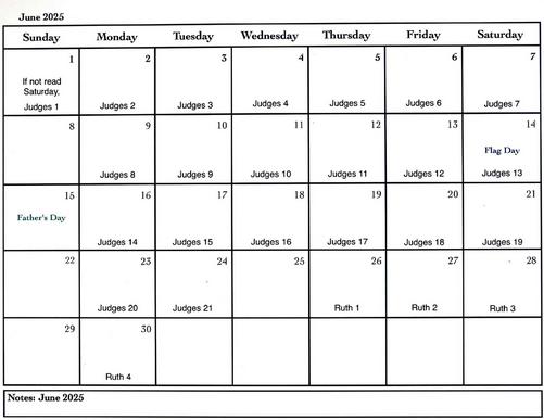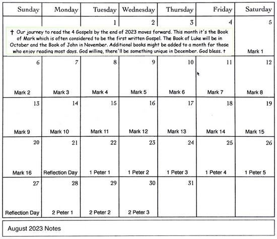 A warning: we're using an old website builder/editor of our provider. If you ever find the last month's calendar still on the home page, hopefully you'll be able to keep up reading for at least a month. Realistically, the day will come when we're no longer able to do this. But we'll try to keep it on-line as long as possible. Meanwhile, feel free to take screen shots of the calendars to use as templates for yourself. We old folks like the idea of leaving a legacy.