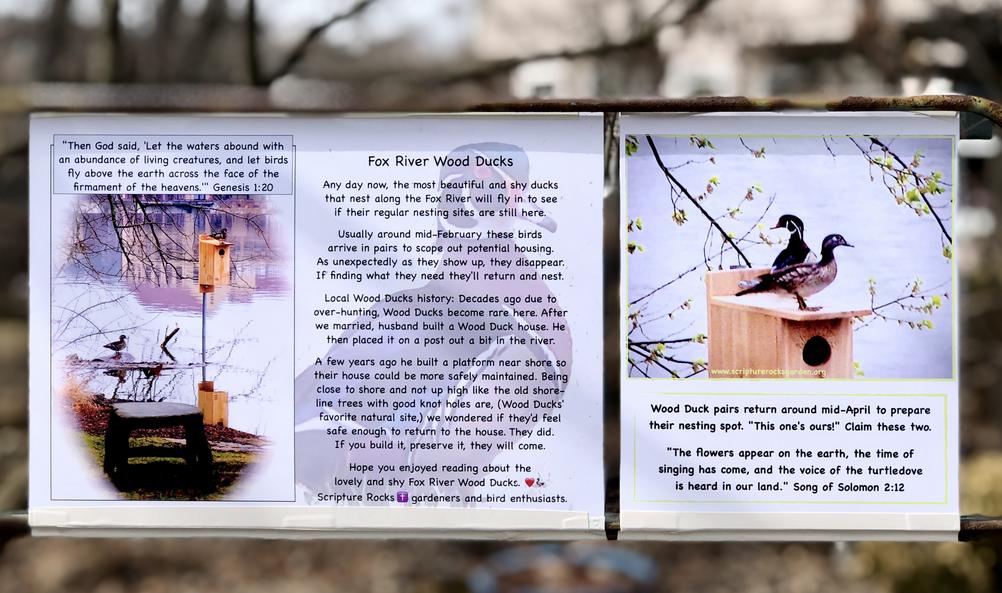 Right now it's Wood Duck season. If you zoom into the photos above which were posted on the cart next to the Scripture Rocks Garden's gate, you'll be able to get a brief idea about them.