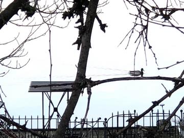 Some Ducks play an April Fools Joke on us. Wednesday,April1, 2026. April Fools Day, 8:10 AM, no Wood Duck. A male Mallard swam around the Wood Duck house as does a male Wood Duck. Something was atop the Wood Duck house so went to get field glasses. It looked like a female Wood Duck was primly sitting atop the house. However, both female Wood Duck and Mallard look alike except for the eyes. A Mallard has a heavy dark stripe over the top of her eye while a Wood Duck has exotically drawn white outlines around hers. Tree branches kept the duck's eyes hidden. Finally the female turned her face towards me and I saw it wasn't a Woodie, but a Mallard, in fact the one from the backyard pair who beg crackers most mornings. She saw me moving about by the window, then quacked at her male. The pair took flight into the side yard. Atop the Wood Duck house she had a real "bird's eye view" of our stirrings inside. No Wood Ducks that day. Did the Woodies and Mallards plan the prank together?
